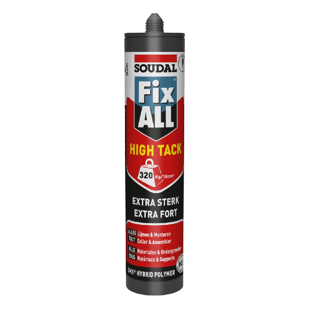 Soudal Fix ALL High Tack est une colle de montage polymère hybride à très haute adhérence initiale, idéale pour fixer des objets lourds sans support temporaire. Grâce à sa technologie SMX, elle offre un collage extrêmement puissant tout en restant élastique et durable.